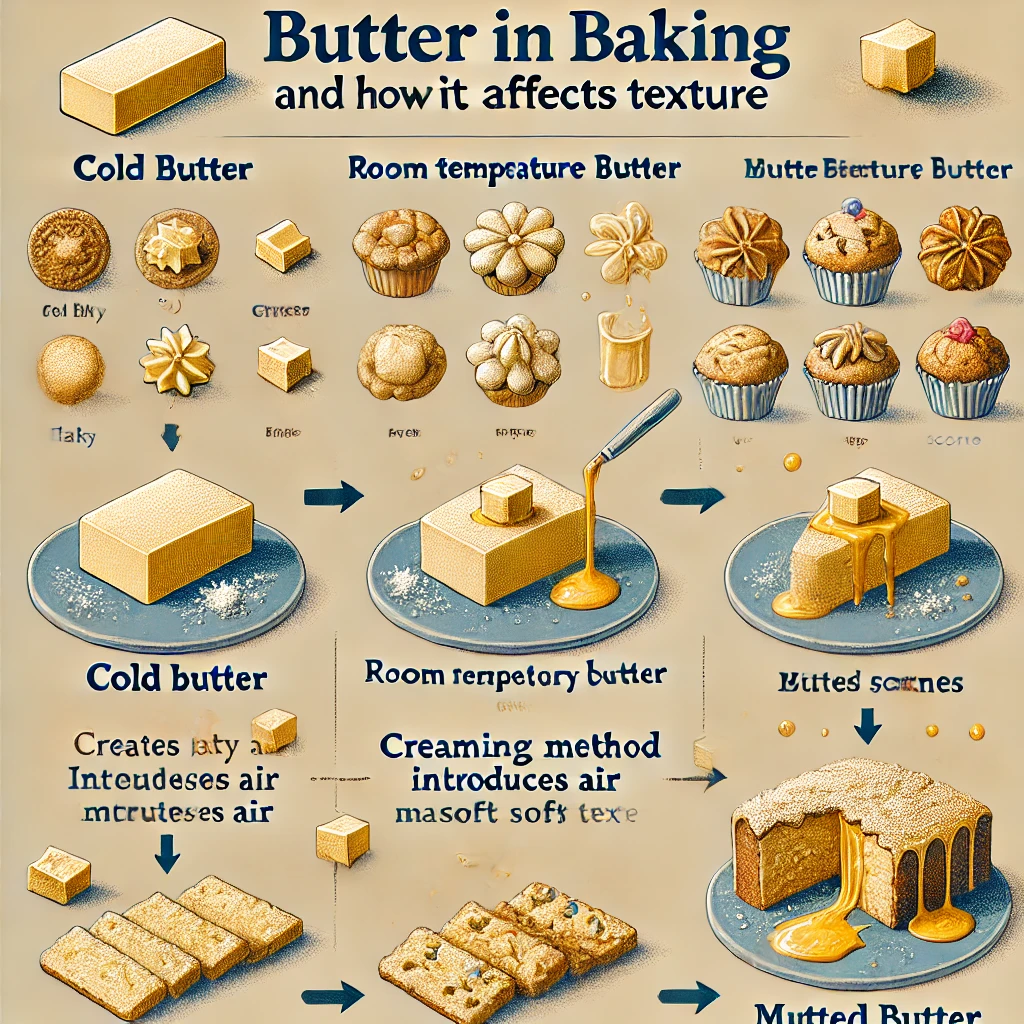 - 차가운 버터를 사용하면, 반죽 중 버터가 밀가루 입자 사이에 자리 잡아 결이 살아있는 반죽이 형성됩니다. (예: 페이스트리, 스콘)
