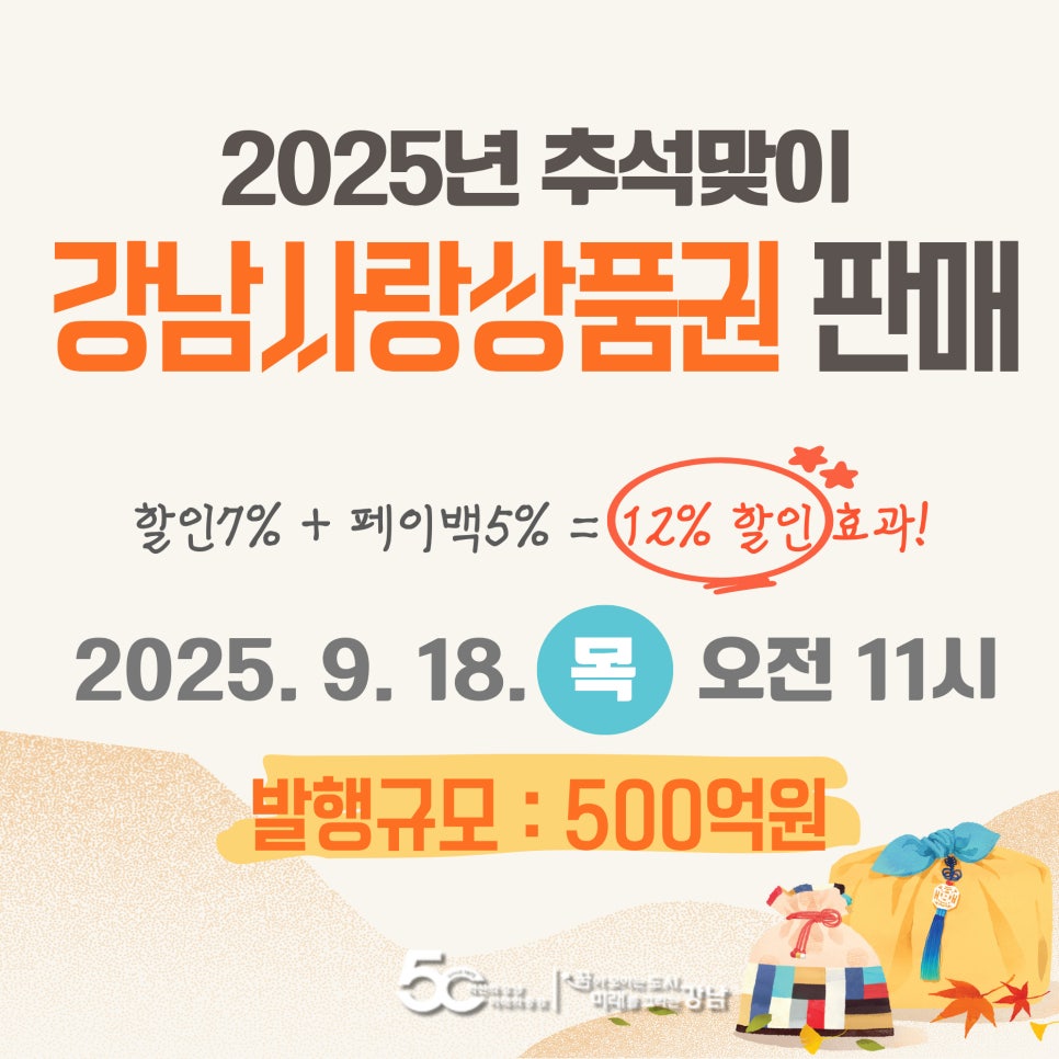 2025년 추석, 강남구민에게 더욱 반가운 소식이 찾아왔습니다. 강남사랑상품권이 특별 할인 혜택과 함께 판매됩니다. 명절 준비에 지출이 많아지는 시기, 총 12%의 할인 효과를 통해 알뜰하게 소비하고, 지역 경제도 함께 살리는 기회를 놓치지 마세요.